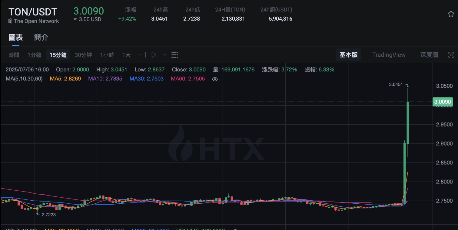 深潮 TechFlow 消息,7 月 6 日,据 HTX 行情数据显示,受“Toncoin 与阿联酋合作”消息影响,TON 突破 3 美元,现报 3.0090 美元,24 小时涨幅 9.42%。