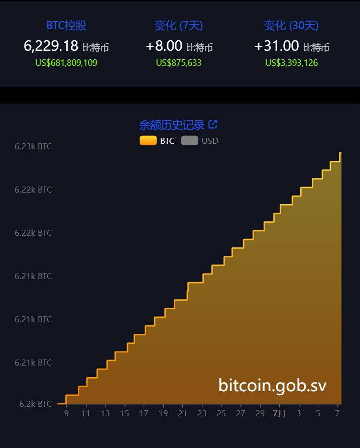 萨尔瓦多近一周累计增持 8 枚比特币,总持仓增至 6229.18 枚