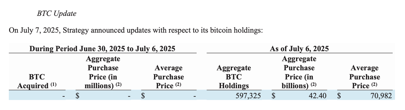 深潮 TechFlow 消息,7 月 7 日,据官方文件披露,Strategy 在 6 月 30 日至 7 月 6 日期间未购入比特币。