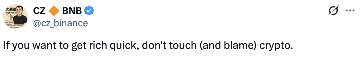 深潮 TechFlow 消息,7 月 7 日,币安(Binance)前CEO赵长鹏(CZ)在社交媒体平台X上发文表示:"如果你想快速致富,就不要触碰(和指责)加密货币。