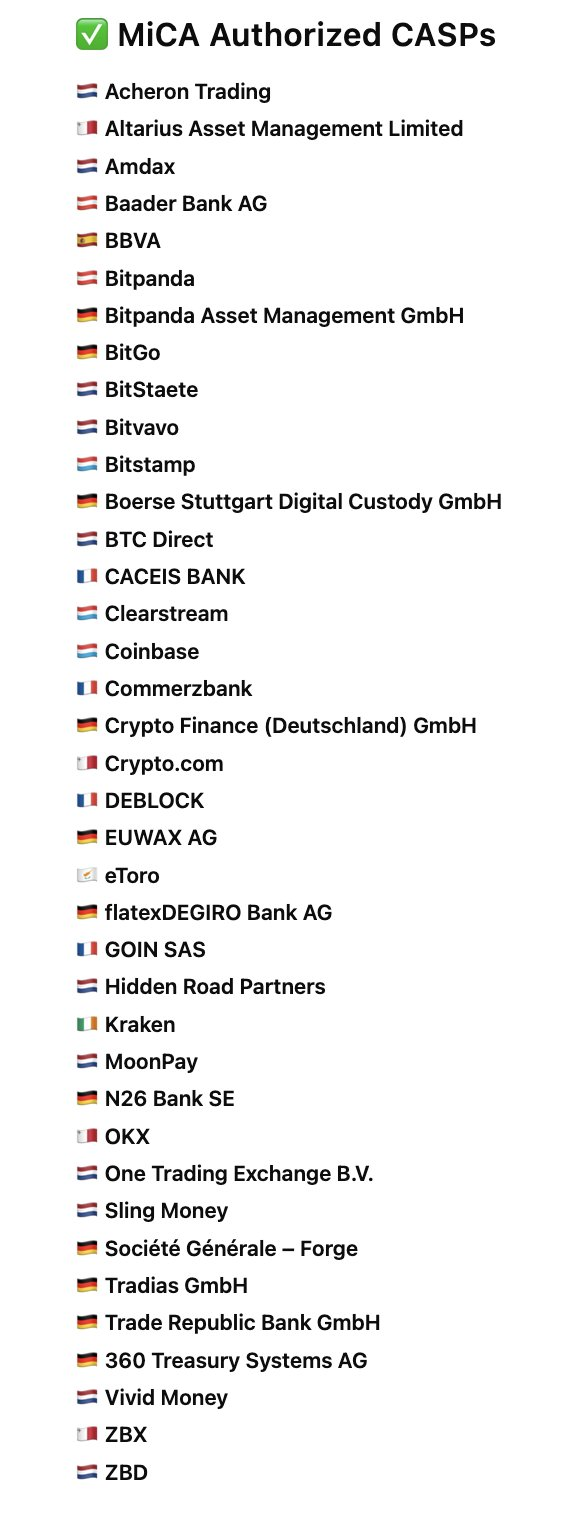 39家CASP获MiCA许可,分布在9个欧盟/欧洲经济区国家,涵盖传统金融(如BBVA、Clearstream、CACEIS)、金融科技(如N26、Trade Republic、eToro、Robinhood)、原生加密企业(如Coinbase、Kraken、Bitpanda、OKX、Bitstamp)等类型。