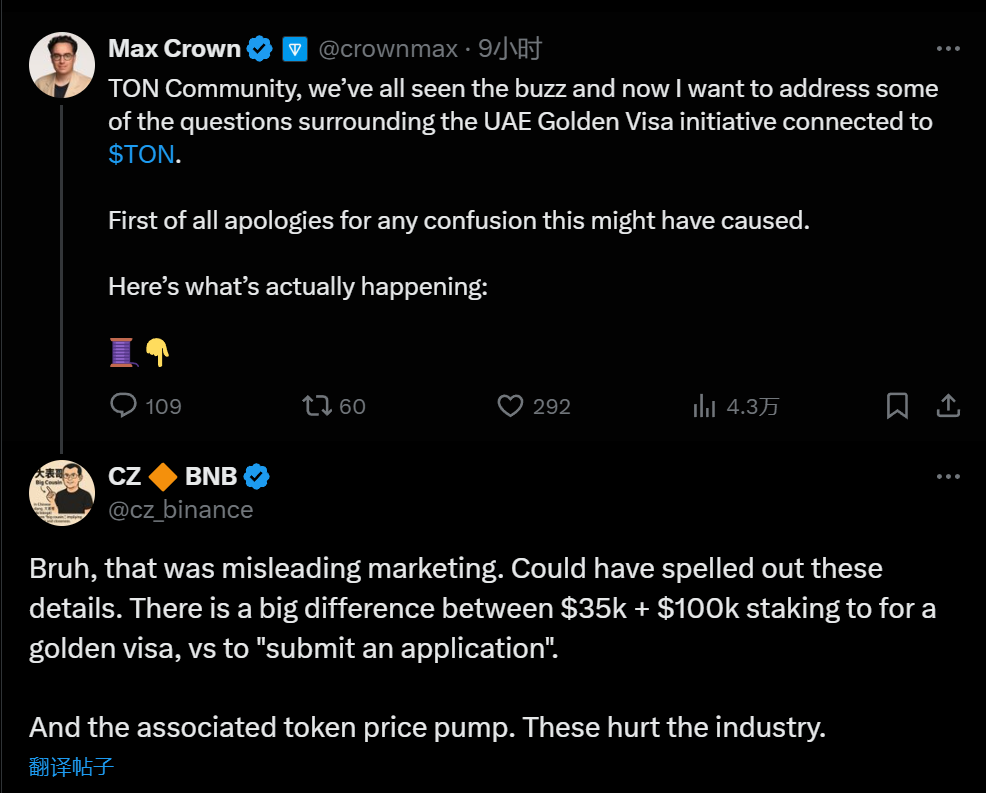 CZ :TON 关于阿联酋“黄金签证”项目的营销方式具有误导性,正在损害整个行业声誉