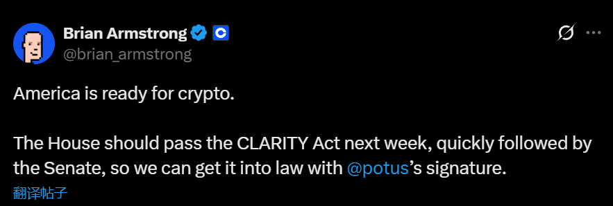 Coinbase CEO 呼吁众议院下周通过《CLARITY 法案》