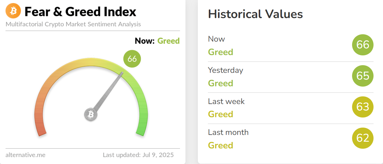 深潮 TechFlow 消息,7 月 9 日,据 Alternative.me 数据,今日加密货币恐慌与贪婪指数升至 66(昨日该指数为 65),表明市场仍处于「贪婪状态」。