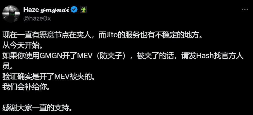 GMGN 联创 Haze:用户若开启 MEV 防夹功能后仍被夹,可申请官方补偿
