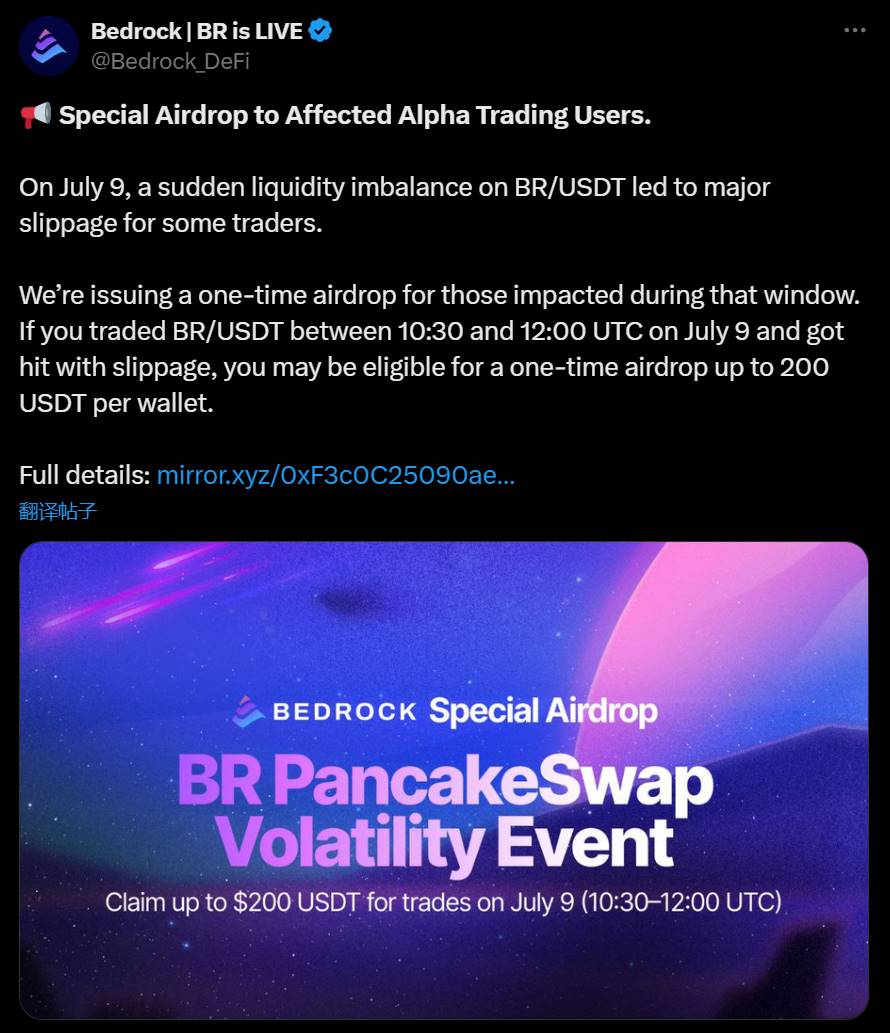 Bedrock:将向币安 Alpha BR/USDT 交易对突发流动性失衡事件中受影响的用户提供空投补偿