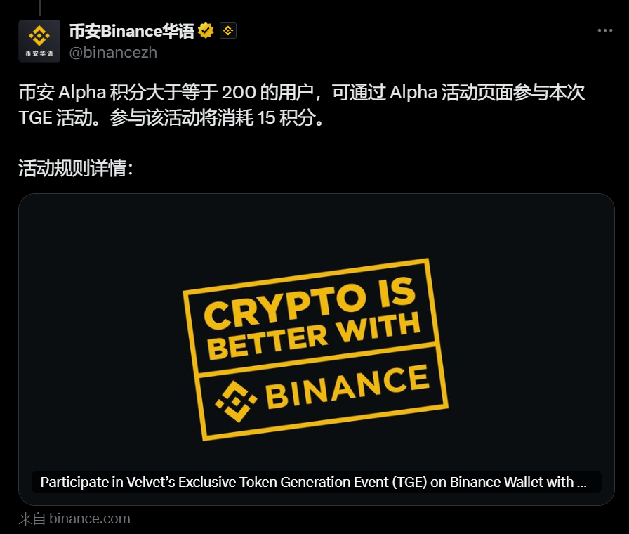 币安:Velvet(VELVET)TGE 活动的参与门槛为 200 Alpha 积分