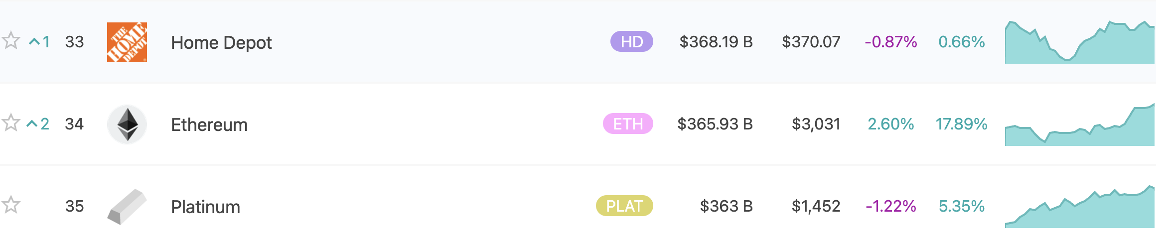 以太坊市值超越白金,全球资产排名升至第 34 位
