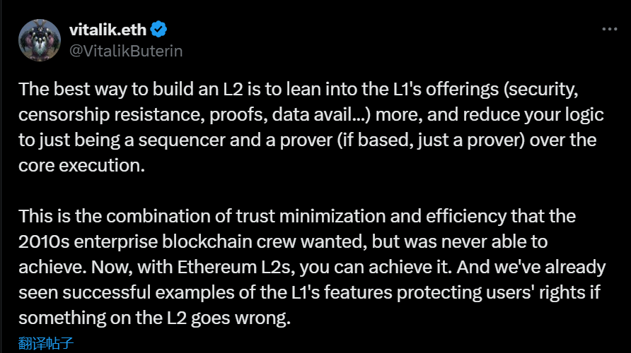 深潮 TechFlow 消息,7 月 15 日,以太坊联合创始人 Vitalik Buterin 在社交媒体发文表示,构建二层网络(L2)的最佳方式是更多依赖一层网络(L1)提供的安全性、抗审查能力、证明和数据可用性等功能,并将自身逻辑简化为仅作为排序器和证明者(如果基于证明,则仅作为证明者)来处理核心执行。
