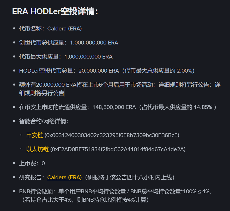 深潮 TechFlow 消息,7 月 16 日,据官方公告,币安HODLer空投现已上线第27期项目 – Caldera (ERA)。它是rollups的互联网,是一个模块化、互联互通、可定制化区块链的生态系统。2025年07月01日08:00至2025年07月06日07:59(东八区时间)期间,使用BNB申购保本赚币(定期和/或活期)或链上赚币产品的用户,将获得空投分配。HODLer空投信息预计将在24小时内上线,新代币将在交易开始前至少 1 小时分发至用户的现货钱包。