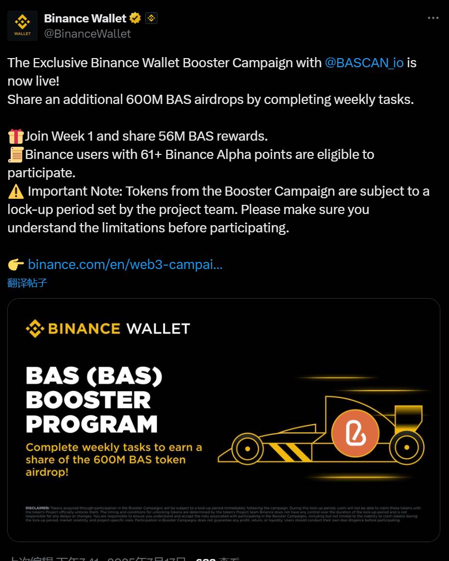 币安:BAS Booster 活动已开启, Alpha 积分大于等于 61 的用户可参与