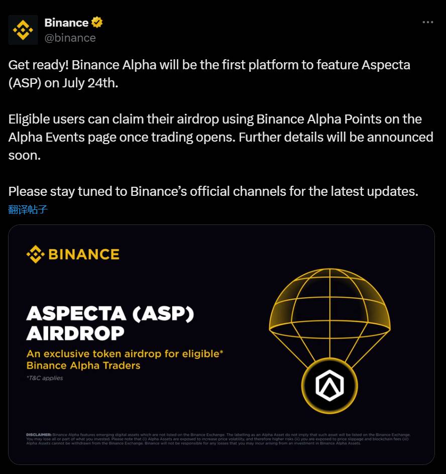 Binance Alpha 将于 7 月 24 日上线 Aspecta (ASP)