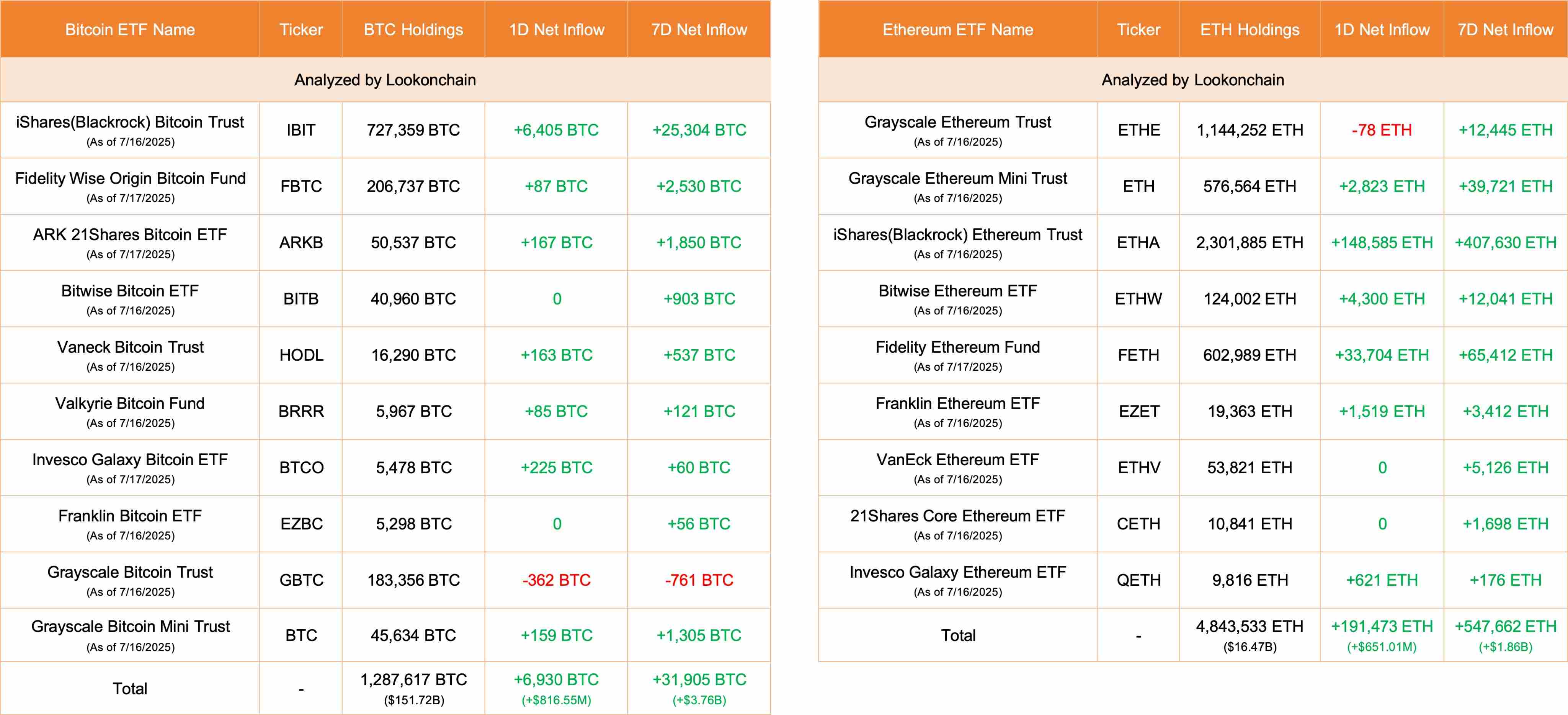 深潮 TechFlow 消息,7 月 17 日,据 Lookonchain 监测,截止于发稿,今日 10 只比特币 ETF 净流入 6,930 枚 BTC(价值 8.1655 亿美元),9 只以太坊 ETF 净流入 191,473 枚 ETH(价值 6.5101 亿美元)。