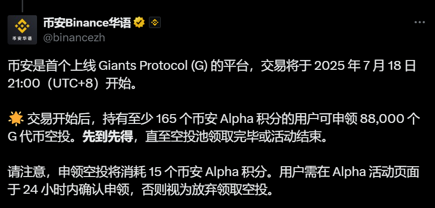 币安 Alpha:Giants Protocol (G) 空投申领门槛上调至165 Alpha 积分