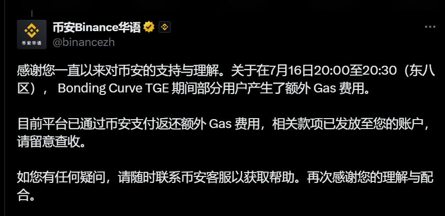 币安:已向用户返还 Bonding Curve TGE 期间产生的额外 Gas 费用