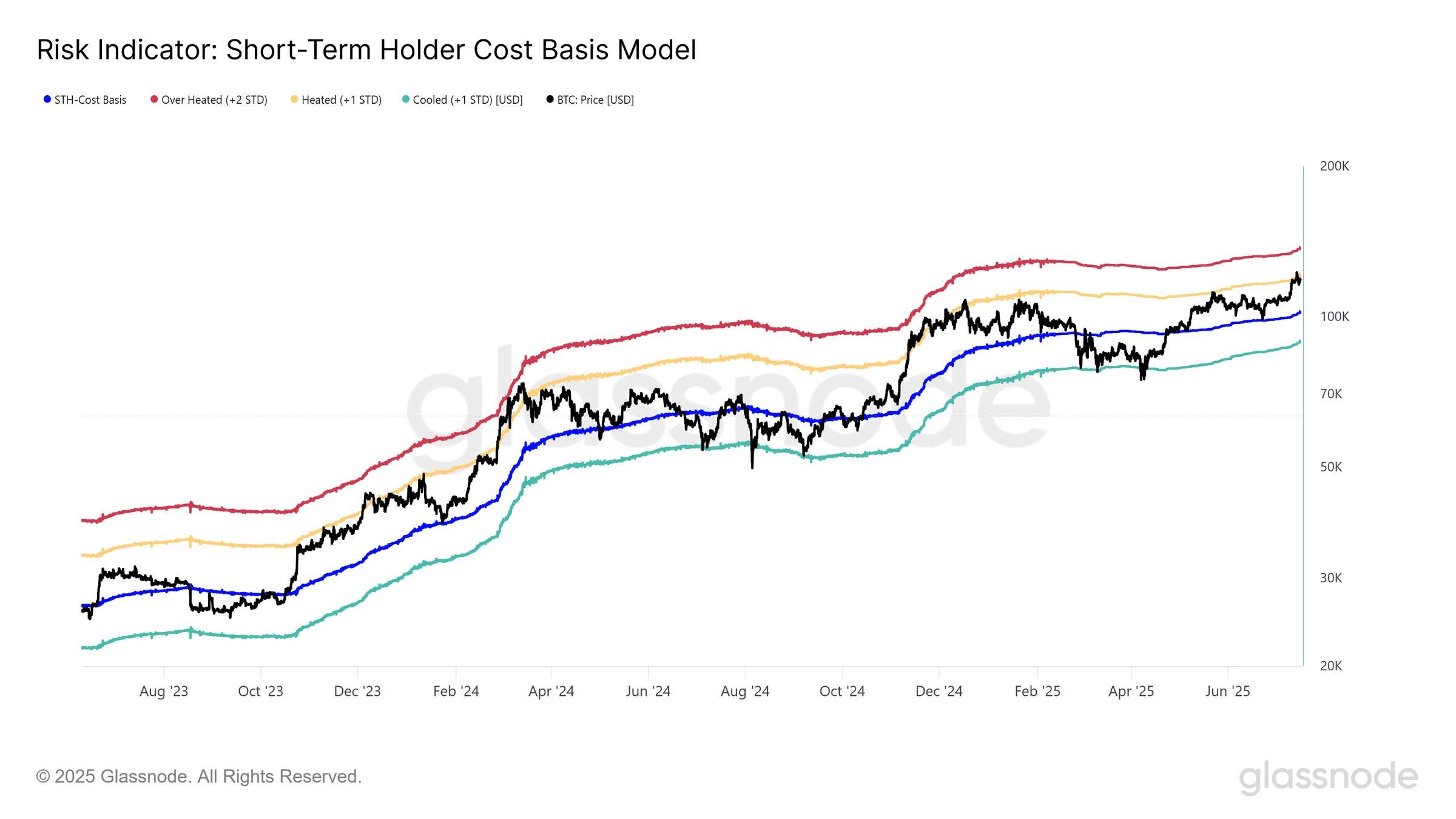 深潮 TechFlow 消息,7 月 18 日,据 Glassnode 在社交媒体发文分析称,比特币价格已触及短期持有者成本基础上方 +1 标准差(约 12 万美元)的水平。历史数据显示,这一水平在强势动能阶段通常会形成阻力。如果当前趋势持续,下一个阻力位将位于 +2 标准差处,约为 13.6 万美元。