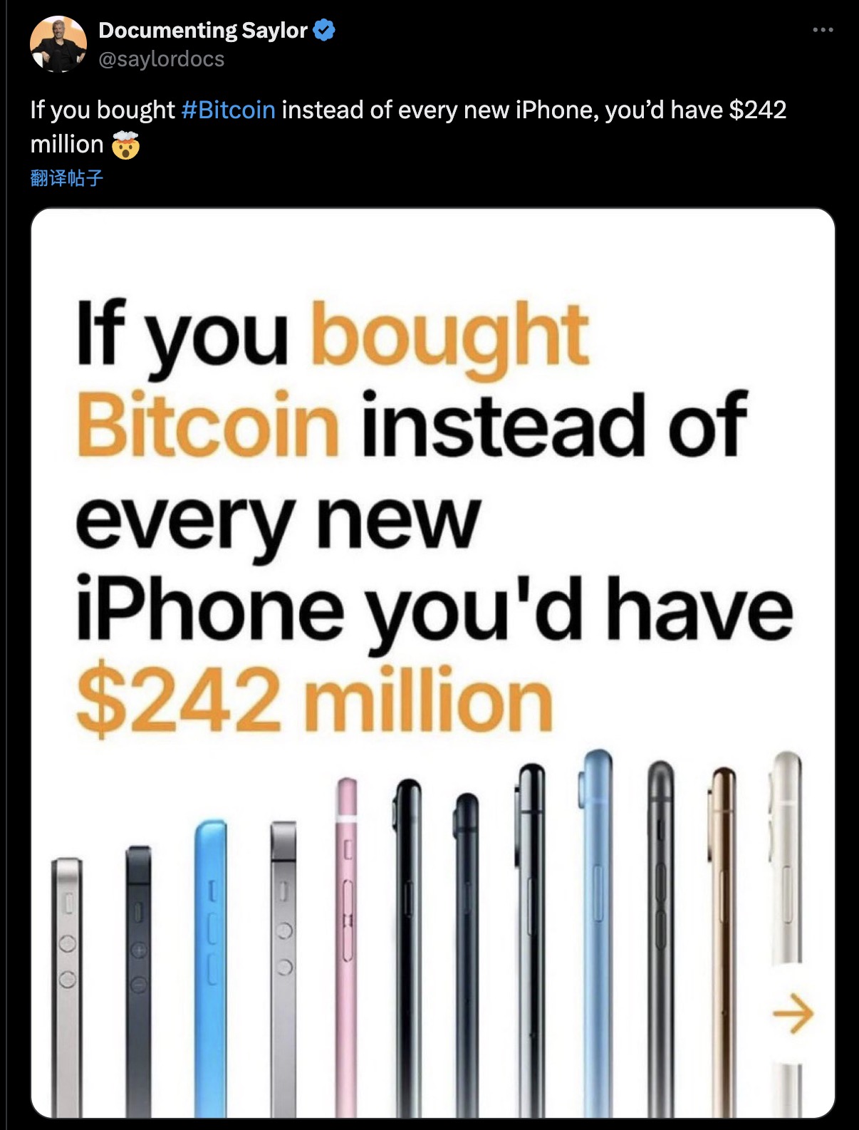 深潮 TechFlow 消息,7 月 19 日,Strategy 执行主席 Michael Saylor 在 X 平台转发推文称,如果每次新款 iPhone 发布的时候,不选择购买 iPhone,而是用相同售价金额买入比特币,目前收益或可达 2.42 亿美元。