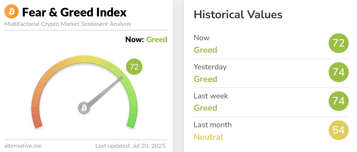 深潮 TechFlow 消息,7 月 20 日,据 Alternative.me 数据,今日加密货币恐慌与贪婪指数降至 72(昨日该指数为 74),表明市场仍处于「贪婪状态」。