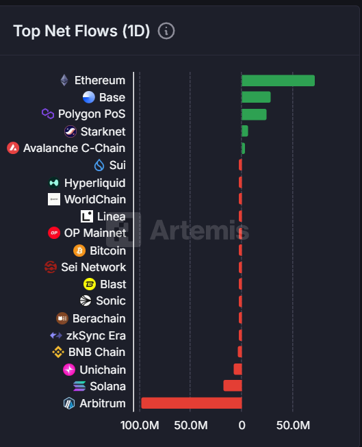 今日链上资金流向:以太坊净流入7180万美元,Arbitrum净流出9710万美元
