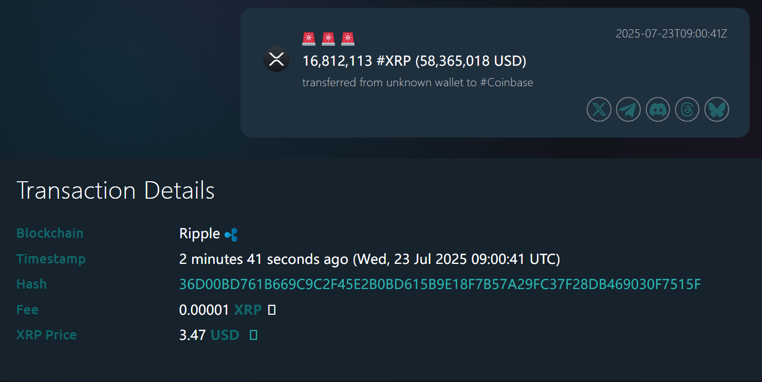 某地址 3 分钟前向 Coinbase 转入 1,681 万枚 XRP,价值 5,837 万美元