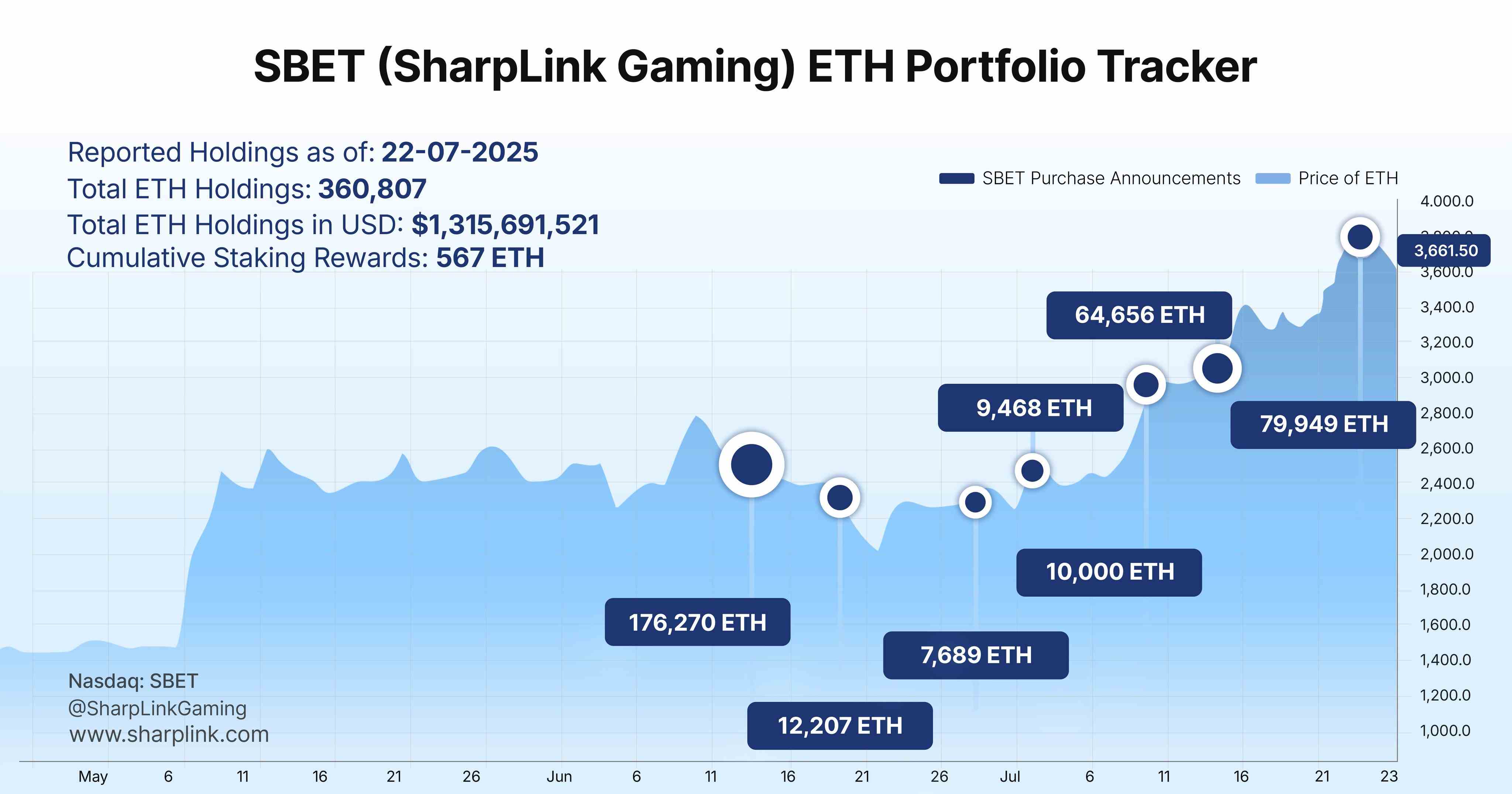 深潮 TechFlow 消息,7 月 23 日,据官方公告,美股上市公司 SharpLink Gaming 公布其以太坊持仓数量为 360,807 枚,并已通过质押产生 567 枚 ETH 的收益。
