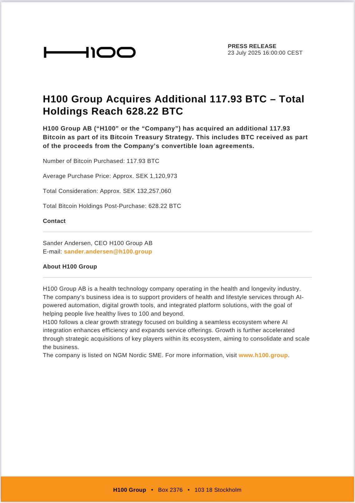 瑞典上市公司 H100 Group 增持 117.93 枚 BTC,总持仓达 628.22 枚