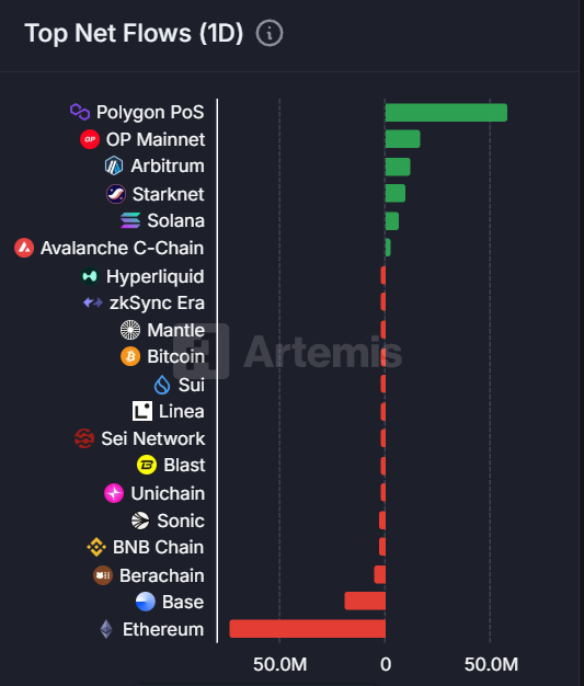 今日链上资金流向:Polygon PoS 净流入 5800 万美元,以太坊净流出 7290 万美元