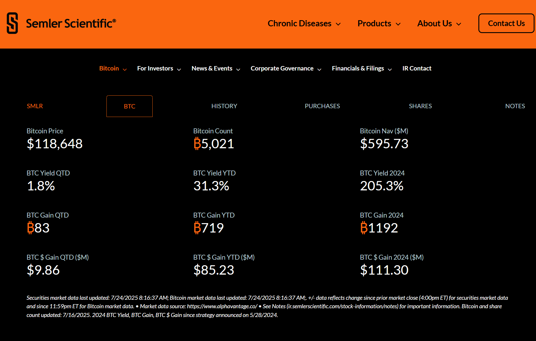 深潮 TechFlow 消息,7 月 24 日,官方页面显示,美股上市公司 Semler Scientific 增持 175 枚 BTC,总持有量达 5021 枚 BTC,今年以来 BTC 收益达 8523 万美元。