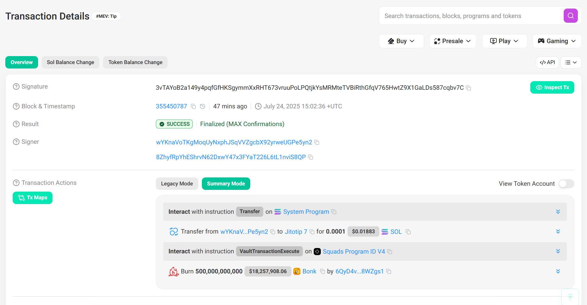 BONK:已销毁 5000 亿枚 BONK,约 1862 万美元