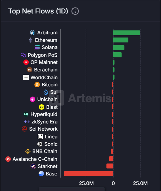 今日链上资金流向:Arbitrum 净流入 2500 万美元,Base 净流出 4490 万美元