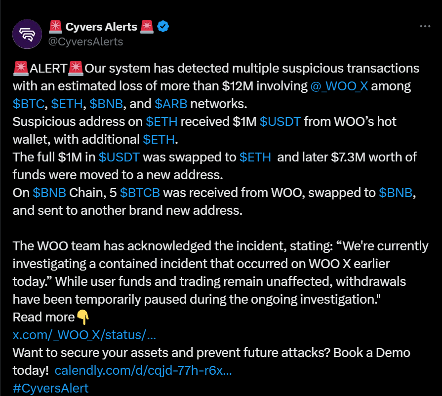 深潮 TechFlow 消息,7 月 24 日,Cyvers Alerts 在社交平台发文表示,“检测到涉及 WOO X 的多笔可疑交易,涵盖 BTC、ETH、BNB 和 ARB 网络,预计损失超过 1200 万美元。