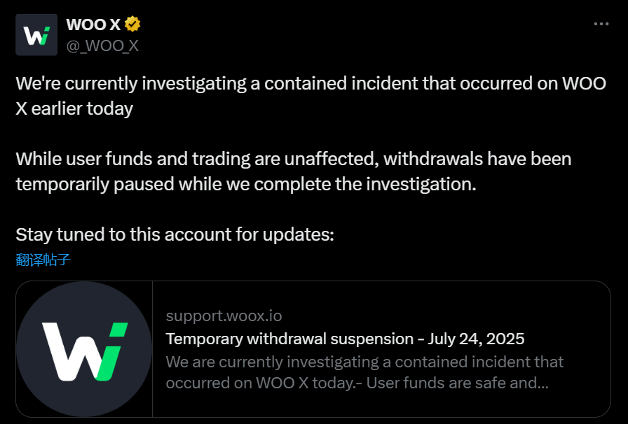 WOO 团队已确认该事件,并表示:“我们正在调查今天稍早发生在 WOO X 平台上的一起受限事件。”目前用户资金和交易未受影响,但在调查期间,平台已暂时暂停提款。