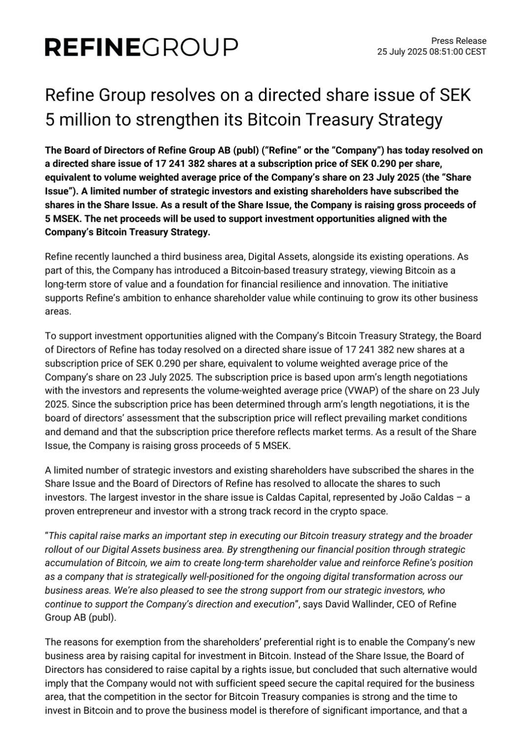 深潮 TechFlow 消息,7 月 25 日,据 NLNico 披露,瑞典公司 Refine Group AB 额外募集了 500 万瑞典克朗(约合 52 万美元)资金,专门用于购买比特币。该笔资金将进一步增强公司的比特币储备配置。