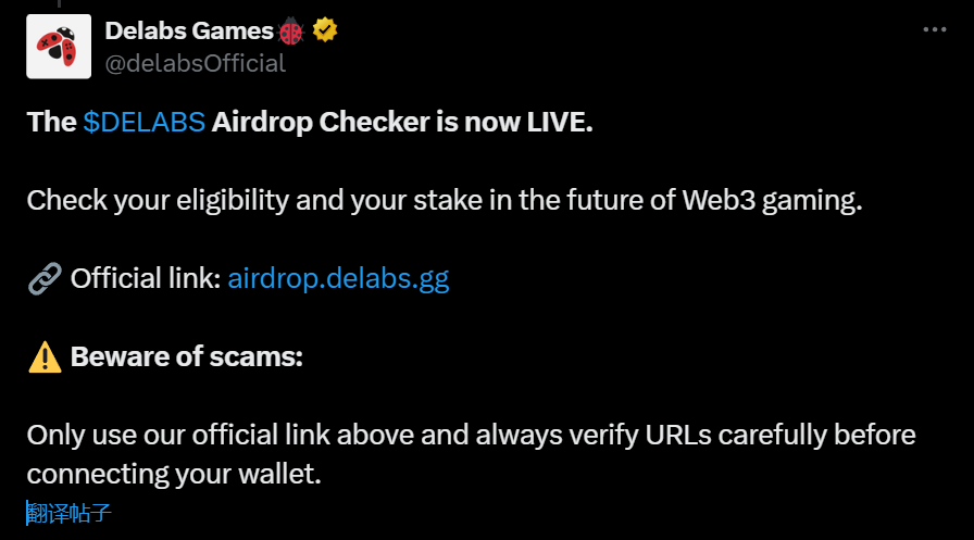 Delabs Games 宣布 DELABS 代币空投资格查询功能已上线