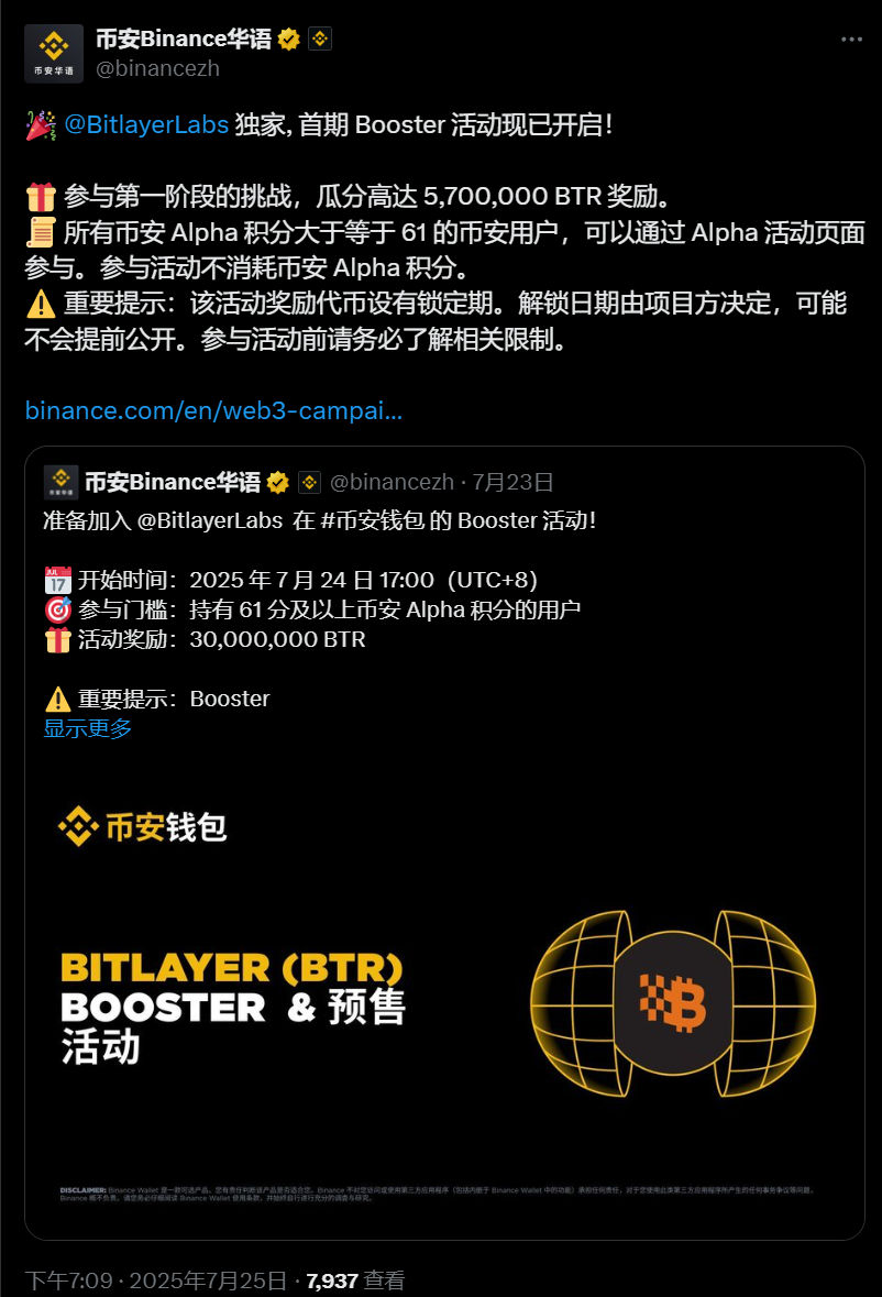 币安钱包 Bitlayer Booster 活动已上线,参与门槛为 61 Alpha 积分