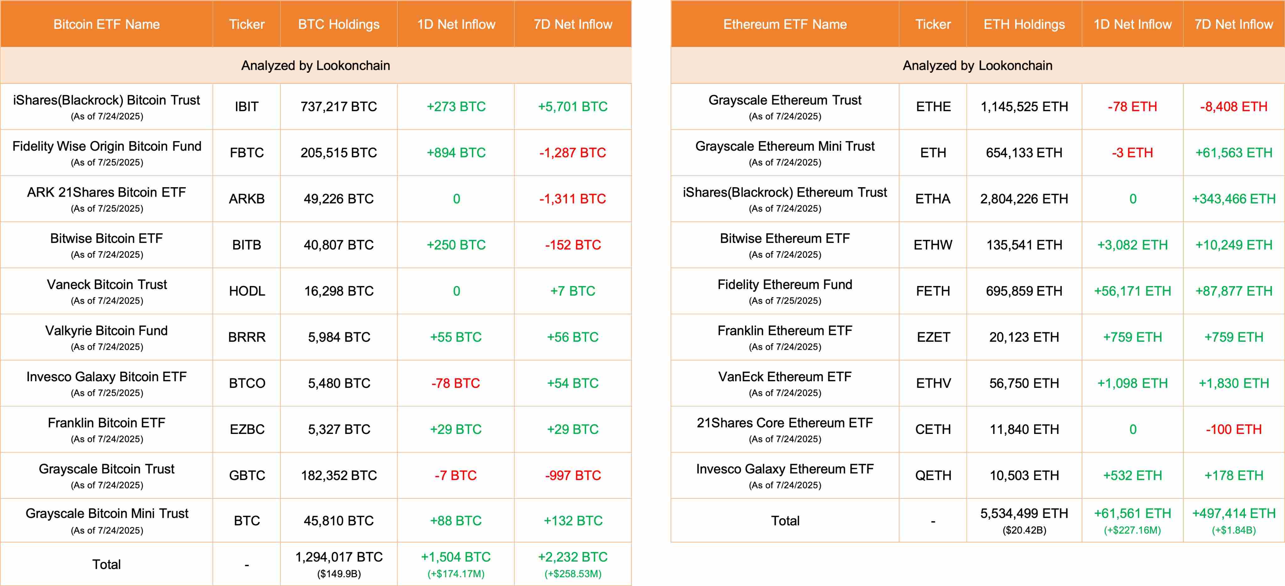 深潮 TechFlow 消息,7 月 25 日,据 Lookonchain 监测,截止于发稿,今日 10 只比特币 ETF 净流入 1,504 枚 BTC(价值 1.7417 亿美元),9 只以太坊 ETF 净流入 61,561 枚ETH(价值 2.2716 亿美元)。