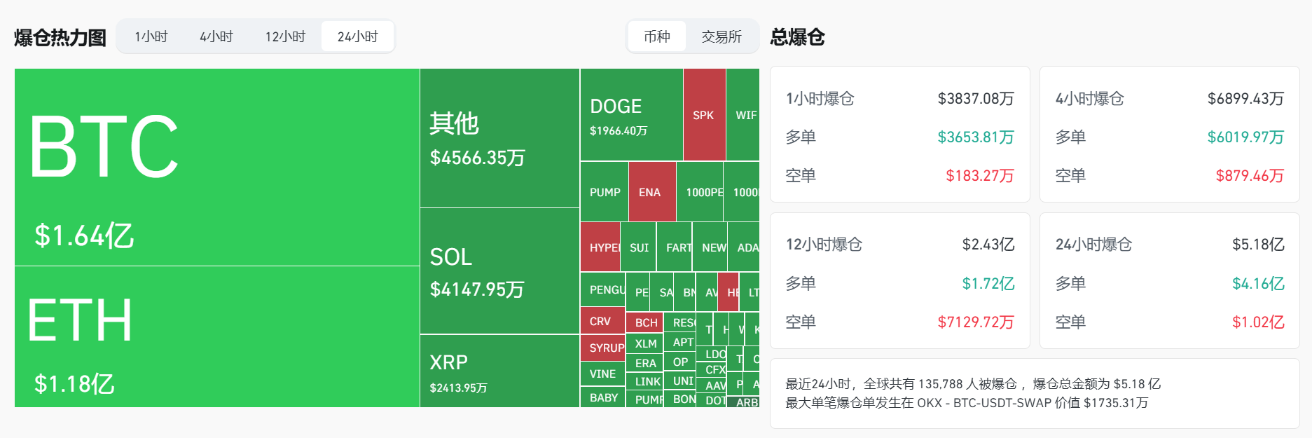 过去 24 小时全网爆仓 5.18 亿美元,主爆多单