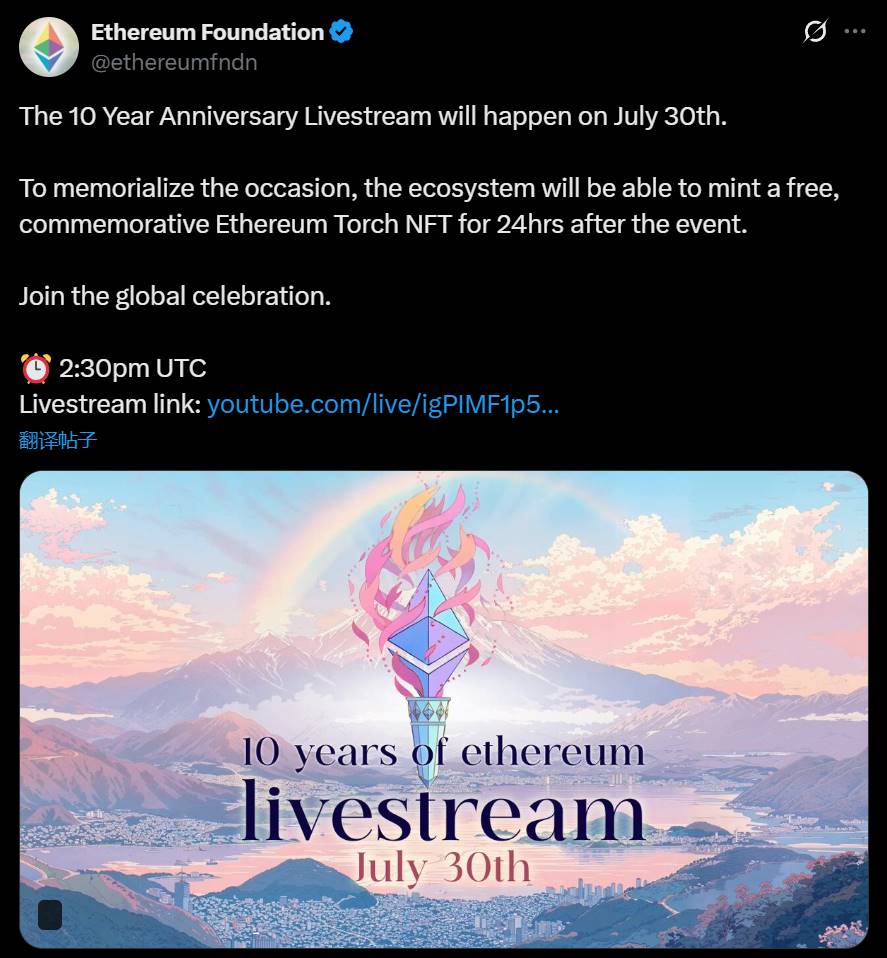 以太坊基金会宣布将于 7 月 30 日举办 10 周年庆典直播,推出限时免费 NFT