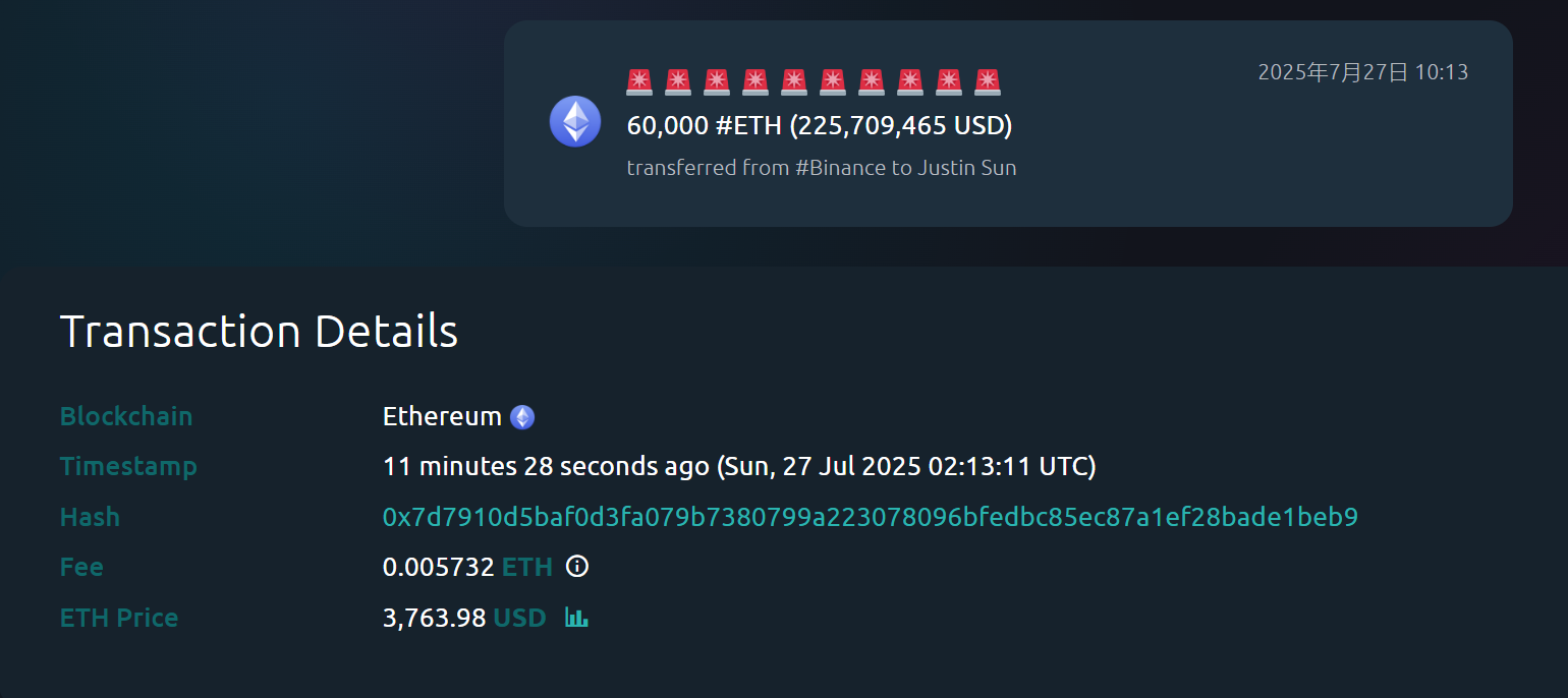 深潮 TechFlow 消息,7 月 27 日,据 Whale Alert 监测,6 万枚 ETH 从币安转移至 Justin Sun 地址,约合 2.26 亿美元。