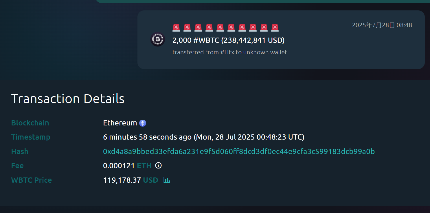 深潮 TechFlow 消息,7 月 28 日,据 Whale Alert 监测,约 7 分钟前,2,000 枚 WBTC 从 HTX 转移至未知钱包地址,价值约 238,442,841 美元。
