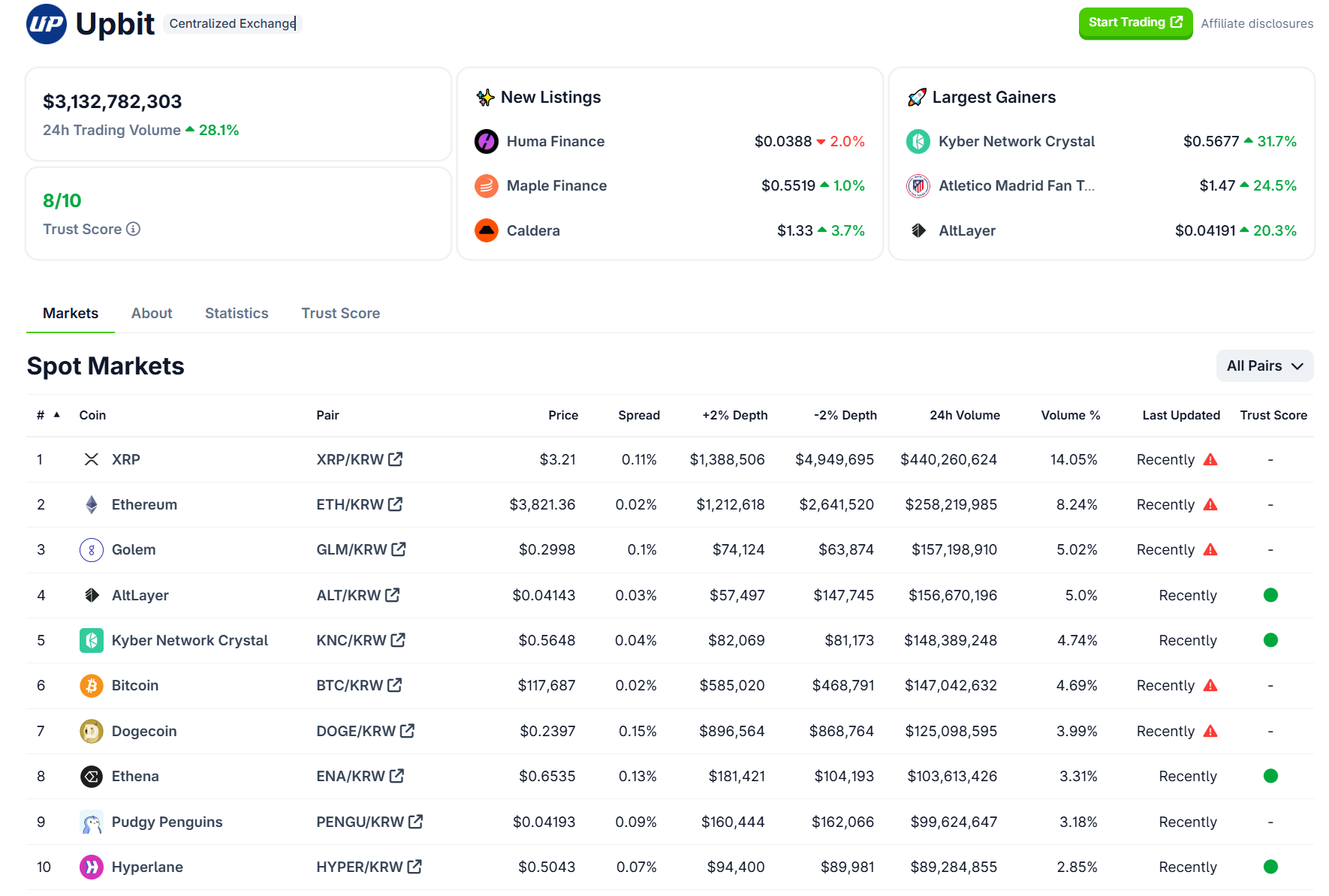 Upbit 24 小时交易量排行:XRP、以太坊、GLM 位居前三