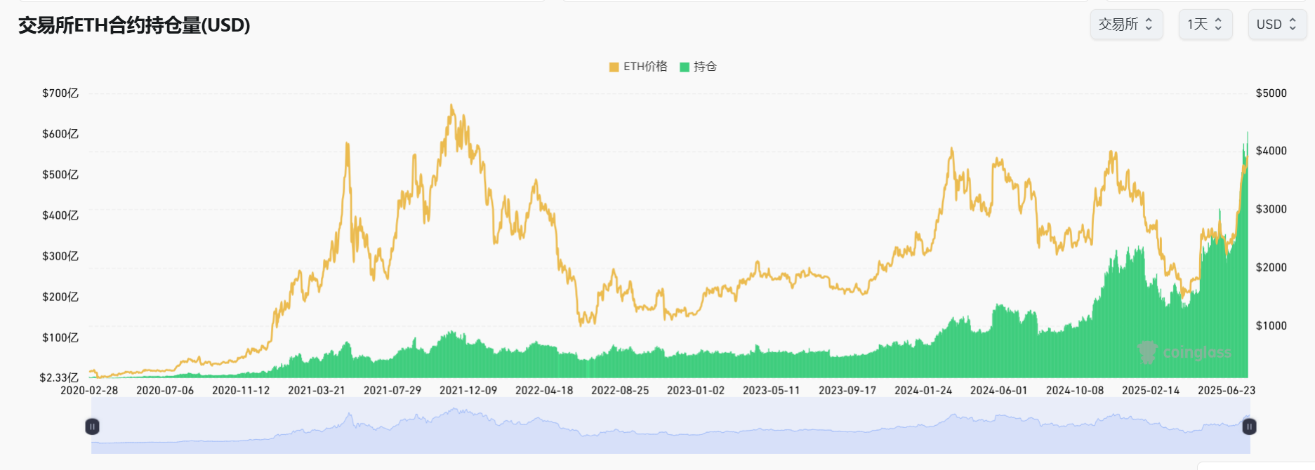 全网以太坊未平仓合约量突破 600 亿美元,24 小时增长 8.17%,续创历史新高