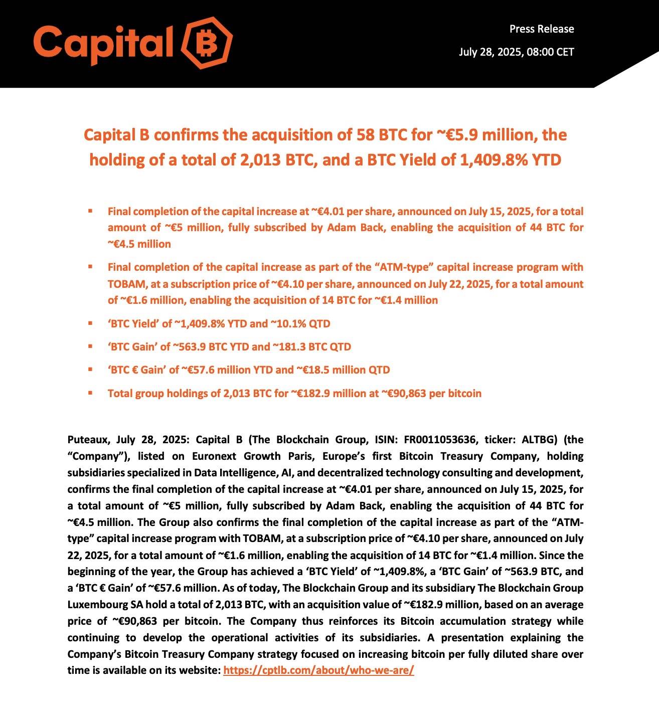 深潮 TechFlow 消息,7 月 28 日,据官方公告,欧洲上市公司 Capital B 以约 590 万欧元收购 58 枚 BTC。此次收购后,Capital B 的比特币总持有量达到 2,013 枚。该公司年初至今的 BTC 收益率达到 1,409.8%。
