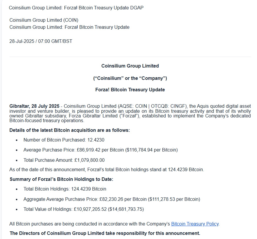 深潮 TechFlow 消息,7 月 28 日,据官方公告,英国上市公司 Coinsilium Group 子公司 Forza 增持 12.4230 枚 BTC,目前总持有量已达 124.4239 枚 BTC。