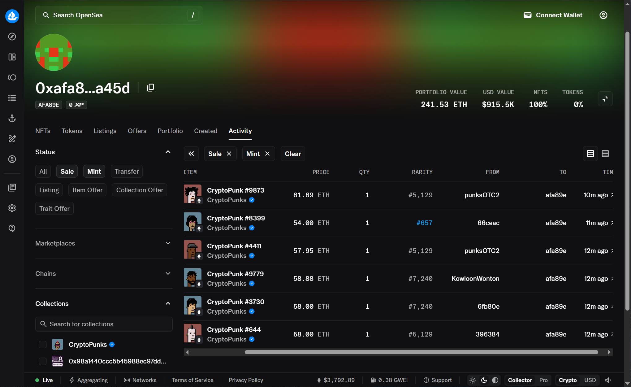 深潮 TechFlow 消息,7 月 29 日,据 Opensea 数据,鲸鱼地址 afa89e 15 分钟内买入了 6 枚 CryptoPunk,总价值约 130 万美元。