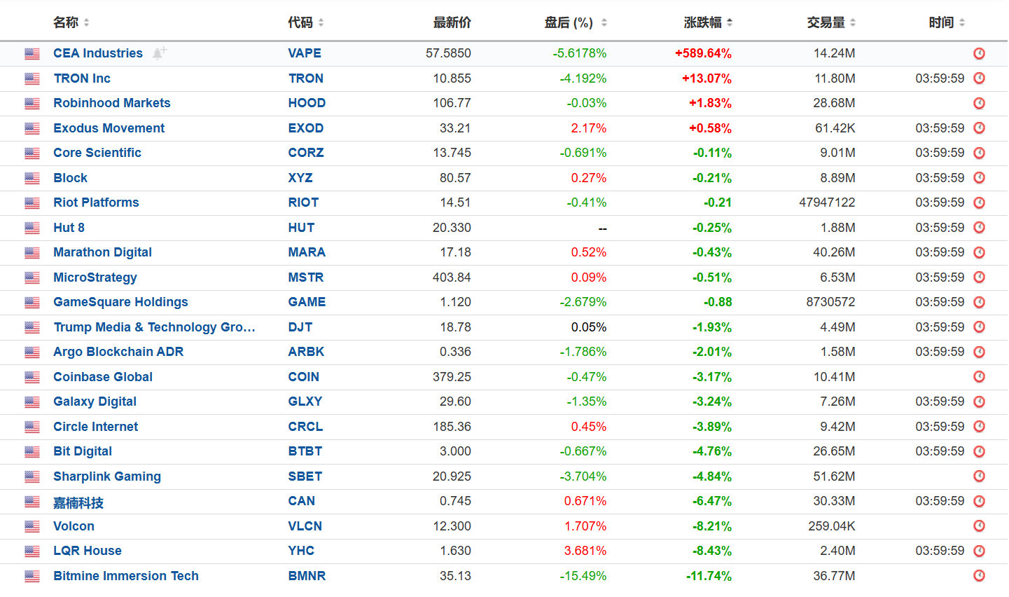 美股加密概念股昨夜收盘涨跌不一,VAPE 涨 589.64%,BMNR 跌 11.74%