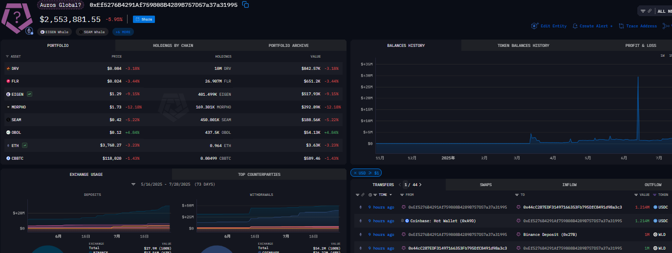 疑似Auros Global标记地址今晨将100万枚WLD转入币安