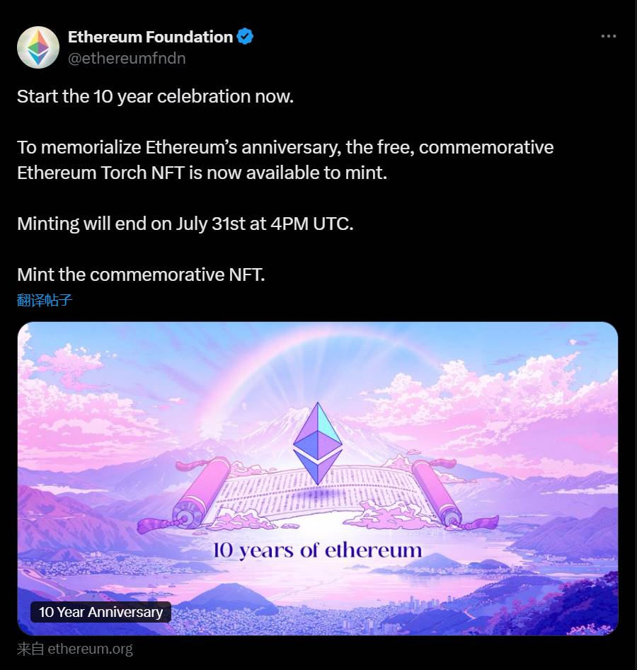 深潮 TechFlow 消息,7 月 30 日,据官方公告,以太坊十周年火炬纪念 NFT 免费铸造现已开放,铸造将于 7 月 31 日 24 时(UTC+8)结束。