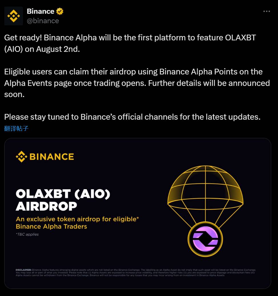 币安 Alpha 将在 8 月 2 日上线 OLAXBT (AIO),符合条件的用户可申领空投