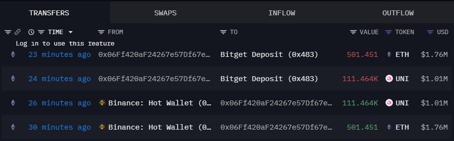 某鲸鱼从币安提取约11.1万枚UNI和501枚ETH后转入另一CEX,价值277万美元
